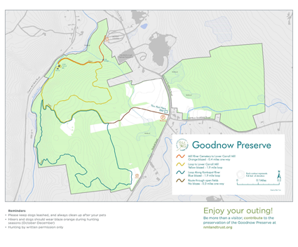 Some 300 acres of open fields, dense forest and woodland roads comprise the Goodnow Preserve. From the parking area, walk diagonally across the field, across the culvert and up along the edge of the field until you come to the second pasture. At the middle of the pasture, a trail to the right goes into the woods and leads to a hidden lower pasture; a trail to the left follows a stone wall to a pasture on Hadsell Street. The land slopes down – sometimes gently, sometimes steeply – to the Konkapot River. The adventurous will follow an old woods road downhill about one-half mile to the remnants of the Lower Carroll Mill.